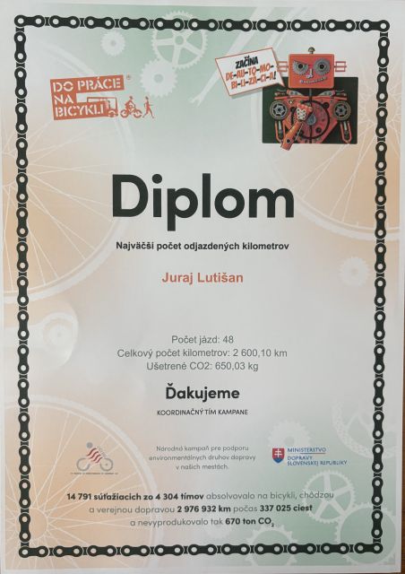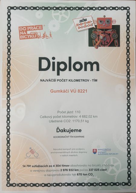 Do práce na bicykli 2025 Ženisti zo Serede opäť ukázali, že majú chuť šliapať do pedálov! Do kampane Do práce na bicykli 2025 v meste Sereď sa zapojilo 107 účastníkov v 30 tímoch z 11 firiem a organizácií, ktorí spoločne najazdili neuveriteľných 17 461,86 km a ušetrili až 4 365,68 kg CO₂. Víťazi kampane – tím Gumkáči v zložení 91. ženijného pluku / 901. ženijného práporu s neprekonateľným výkonom, ktorí svojimi 4 682 km jasne dominovali a stali sa neoficiálnymi šampiónmi Serede. Ich výkon ukazuje, aká silná môže byť kolektívna motivácia a vytrvalosť aj na dvoch kolesách. Najlepší jednotlivci – naši šampióni v pedálovaní: 1. miesto patrí desiatnikovi Jurajovi Lutišanovi– 2 600 km a 3. miesto kapitánovi Danielovi Servanskému – 1 271 km. Podujatie podporil národný cyklokoordinátor, pán Peter Klučka z Ministerstva dopravy SR. Vo svojom príhovore ocenil prístup mesta Sereď aj všetkých účastníkov, zdôrazňujúc, že bicyklovanie je nielen ekologické, ale predovšetkým prospešné pre zdravie.